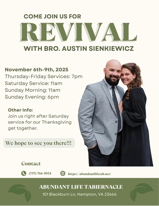 The Abundant Life Tabernacle is a Full Gospel Church that believes in the five cardinal doctrines: Salvation, Sanctification, Baptism of the Holy Ghost, Divine Healing, and the soon return of our Lord Jesus Christ. We also believe it is our duty as Christians to tell the World Jesus Saves. We encourage you to navigate our website and join us for Sunday or Wednesday services, You will find our people to be friendly and the Word of God not watered down. Service times are listed on the Schedule page.